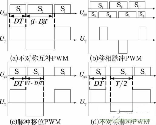 控制型軟開關(guān)半橋DC/DC變換器不增加主電路元器件(可增加電感電容元件以實現(xiàn)軟開關(guān)條件),通過合理設(shè)計控制電路來實現(xiàn)軟開關(guān)。圖1給出4種控制型軟開關(guān)半橋DC/DC變換器的PWM控制策略。