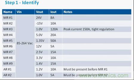 圖1:第一步是列出項(xiàng)目的電源需求。在我們的這個(gè)例子中,我們假設(shè)有11路電壓軌,