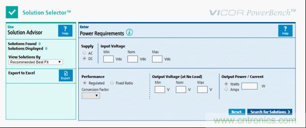 什么樣的產(chǎn)品能夠滿足要求呢?有很多這種信息的來源。例如,Vicor提供了一種解決方案選擇工具,可以搜索可用元件的數(shù)據(jù)庫(kù),并推薦滿足客戶的輸入和輸出需求的解決方案。利用一個(gè)智能工具,如Vicor解決方案選擇工具(solution selector),可將產(chǎn)生可能元件的候選者名單所需要的時(shí)間縮短到幾乎為零,并且可以很容易地根據(jù)對(duì)應(yīng)用來說最重要的標(biāo)準(zhǔn),為特定設(shè)計(jì)選擇一個(gè)最佳的元件。大多數(shù)工程師恰恰沒有令人奢望的“學(xué)習(xí)時(shí)間”來手動(dòng)完成這項(xiàng)重要任務(wù)。