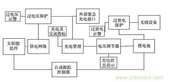 現(xiàn)有的光伏電池,單體的輸出電壓都很低(在1V 以下) ,本設(shè)計中,將多個光伏電池相串聯(lián),組成太陽能組件。通過可以自動調(diào)節(jié)占空比的供電網(wǎng)絡(luò)保證在光照強度變化和負載變化時,輸出電壓基本穩(wěn)定,為充電管理芯片提供穩(wěn)定的電壓輸入。通過對供電網(wǎng)絡(luò)的副邊電壓監(jiān)測,保護充電管理芯片不因電壓過高而損壞。通過對電池兩端的電壓監(jiān)測,保證鋰電池不會因過放電而損壞。由于無線示功儀及其中繼網(wǎng)絡(luò)節(jié)點的供電要求是313V,采用低噪聲、高速度的CMOS型電壓調(diào)節(jié)器。在自動跟蹤控制器作用下,始終保持全天候跟蹤太陽。為了防止因連續(xù)陰雨天而導致的太陽能供電不足,設(shè)計應急充電電路,充電期間,無線示功儀及其節(jié)點正常運行。具體系統(tǒng)設(shè)計模塊如圖1 所示。