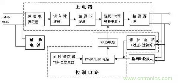 開關電源大至由主電路、控制電路、檢測電路、輔助電源四大部份組成,見圖1。