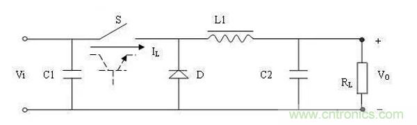 開關電源就是采用功率半導體器件作為開關元件,通過周期性通斷開關,控制開關元件的占空比來調整輸出電壓。開關元件以一定的時間間隔重復地接通和斷開,在開關無件接通時輸入電源Vi通過開關S和濾波電路向負載RL提供能量,當開關S斷開時,電路中的儲能裝置(L1、C2、二極管D組成的電路)向負載RL釋放在開關接通時所儲存的能量,使負載得到連續而穩定的能量。