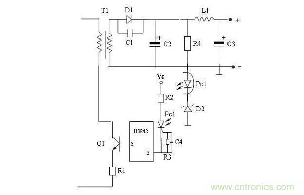經檢查此開關電源采用U3842 PWM控制芯片,經查找相關的資料得知,當U3842芯片的3端電壓高于1伏時,內部電流敏感比較器輸出高電平,將PWM鎖存器復位使輸出關閉。通電測量U3842的3端高于1伏,6端無輸出,經檢查相關電路,發現穩壓管D2擊穿,如圖3,故PC1導通,致使U3842的3端為高電平,故6端無輸出,開關管不工作,直流側無直流輸出。更換同型號穩壓管D2,故障解除。