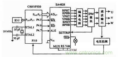 以SA4828與單片機(jī)C8051F020為核心構(gòu)成的控制器電路設(shè)計(jì)如圖4所示。控制電路根據(jù)給定的參數(shù)輸出三相SPWM信號(hào)給智能功率模塊IP-M,實(shí)現(xiàn)對(duì)功率晶體管的通斷控制。C8051F020通過(guò)8位P0端口與SA4828的地址、數(shù)據(jù)管腳AD0~AD7相連,工作時(shí),單片機(jī)首先對(duì)SA4828進(jìn)行初始化,定義載波頻率,電源頻率范圍、死區(qū)、最小脈沖取消時(shí)間等參數(shù)。然后向SA4828的控制寄存器傳送電源的頻率控制字和幅度控制字等參數(shù)。正常工作時(shí),根據(jù)需要對(duì)SA4828的控制數(shù)據(jù)進(jìn)行修改,實(shí)現(xiàn)系統(tǒng)的反饋與實(shí)時(shí)控制,以及調(diào)壓控制。為實(shí)現(xiàn)系統(tǒng)的穩(wěn)壓功能,采用平均值反饋PI調(diào)節(jié)。輸出電壓經(jīng)隔離送入C8051F020單片機(jī)的A/D轉(zhuǎn)換口即P3.0口,轉(zhuǎn)換結(jié)果參與PI運(yùn)算,運(yùn)算結(jié)果即為SA4828幅度控制寄存器的控制字。從RPHT~BPHB的6個(gè)引腳輸出相應(yīng)頻率和電壓的SPWM控制信號(hào),經(jīng)隔離電路后,分別控制智能功率模塊IPM的6個(gè)IGBT的導(dǎo)通與截止,最后在3個(gè)輸出端上產(chǎn)生對(duì)稱的三相SPWM電壓。SA4828作為單片機(jī)的外設(shè),與單片機(jī)并聯(lián),通過(guò)對(duì)單片機(jī)編程,只需將SPWM的初始化信息和控制信息寫(xiě)入SA4828的相關(guān)寄存器,即產(chǎn)生精確的全數(shù)字化的三相的SPWM波形。