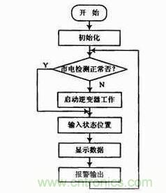 單片機(jī)在初始化程序中完成對(duì)單片機(jī)、SA4828以及其他可編程器件的初始化,接著對(duì)市電進(jìn)行檢測(cè),如果市電不正常,則啟動(dòng)逆變器工作,通過(guò)控制將開(kāi)關(guān)元件切換至逆變器輸出。并將輸入狀態(tài)存入控制寄存器,顯示數(shù)據(jù),如果輸出電壓或保護(hù)等發(fā)生改變,則報(bào)警輸出以采取措施使系統(tǒng)正常運(yùn)行。