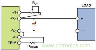 輸出電壓可通過改變連接電源模塊正輸出端或接地端的電阻來進行調節通過連接外部電阻RUP并使RDOWN浮空,可以向上調整輸出電壓(高于標稱輸出電壓),或者通過連接外部電阻RDOWN并使RUP短路(電阻值為零)向下調整(低于標稱輸出電壓)。