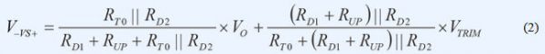 VS+引腳上的正常工作電壓為1V。若 VTRIM為1V左右且RT0遠大于RD2,則可忽略電路的其余分支部分。復合網絡用作簡單分壓器,并調節RUP電阻值,提供類似于模擬控制器的特性,實現了模擬電源模塊中的電壓向上調整。