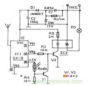 IC1是一只SX-3型人體接近開關集成電路模塊,該器件最大探測距離可達10米。其中紅線接正電源端,黑線接公共端,黃線為+5v電源輸出端,供外部使用,藍線為即時開關信號輸出端(本電路不用),綠線為具有時間累積功能的延時開關信號輸出端。220V市電由C1降壓、D1整流、C2濾波、DW穩壓后為控制電路提供12V直流電源。平時,沒有人接近IC1或當行人很快從報欄前經過時,IC1的VO2端輸出低電平,后級電路不動作,燈不亮。當有人要看報在報欄前停頓數秒后,IC1的V02端輸出高電平。白天時,光敏電阻Rcds為低阻值,V1導通,V2截止,后級電路仍不能工作。晚聞Rcds為高阻值,V1截止,的高電平使V2導通,光電耦合器IC2內藏發光二極管發光,光敏可控硅開通,燈泡ZD發光。閱報者離開后,IC1V02端又變為低電平,ZD自動熄滅。
