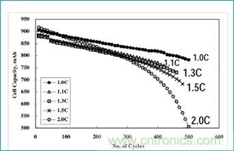 這是關(guān)于鋰離子電池充放電速率與其容量和循環(huán)壽命的關(guān)系圖,縱軸代表容量,橫軸代表循環(huán)壽命,由不同的點(diǎn)所描繪出來的曲線代表了用不同的速率對電池進(jìn)行充放電時容量與循環(huán)壽命之間的關(guān)系。其中的C是與電池的容量有關(guān)的充放電速率數(shù)據(jù),假設(shè)某個電池的容量為1000mAH,如果用1000mA的電流對它進(jìn)行充電或放電,則充滿或放完其全部電能的時間是一個小時,這時候的C就代表1000mA,2C則代表2000mA。根據(jù)這些定義,這個圖告訴我們?nèi)缦滦畔ⅲ哼@個電池的初始容量為900mAH,假如用1C即900mA的電流對它進(jìn)行充放電,經(jīng)過500個循環(huán)后,其容量還剩下大約780mAH;如果用2C即1800mA的電流對它進(jìn)行充放電,則經(jīng)過500個循環(huán)后,其容量會下降到大約500mAH。