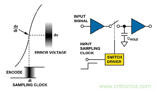 孔徑或采樣時(shí)鐘抖動(dòng)設(shè)定SNR 限值,尤其是對高頻輸入信號。系統(tǒng)抖動(dòng)有兩個(gè)來源:來自片內(nèi)采樣保持電路的孔徑抖動(dòng)(內(nèi)部抖動(dòng)),以及采樣時(shí)鐘上的抖動(dòng)(外部抖動(dòng))。孔徑抖動(dòng)為轉(zhuǎn)換間的 采樣時(shí)間變化,為ADC 的函數(shù)。采樣時(shí)鐘抖動(dòng)通常為主要誤差源,但兩個(gè)源都會(huì)導(dǎo)致模擬輸入采樣時(shí)間變化,如圖9所示。它們的影響難以區(qū)分。
