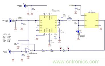 圖1顯示的是一個通過高側感測電阻器R3直接驅動LED中電流的降壓轉換器,TPS54218,同步降壓控制器。這個電流感測電壓被電流感測監視器,INA193,放大20倍,這樣可顯著地降低R3中的功率耗散并提升效率。分流監視器的電流反饋信號輸出給電阻分壓器 (R6/R8),這形成了到VSENSE的完整反饋路徑。