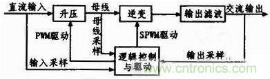 系統的整體框架如圖1所示。系統采用高頻逆變方案,即前級升壓加后級逆變的結構,這樣可以避免使用笨重的工頻變壓器,有效的降低了電源的體積、重量及成本,提升電源的效率。電路的工作原理是,12 V的直流輸入電壓經過濾波后由推挽升壓和全橋整流升壓到350 V的直流母線電壓,再經過全橋逆變電路轉變為220 V/50 Hz的工頻交流電,采樣電路對相應點進行采樣,以實現閉環控制及保護功能。