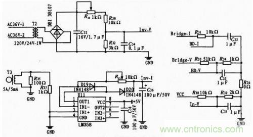 輸出電壓采樣用于反饋穩壓,輸出電流采樣用于過載保護,母線電流采樣用于短路保護,母線電壓采樣用于限制母線電壓虛高,輸入電壓采樣用于輸入過壓/欠壓保護。輸出采樣中使用了電流互感器與電壓互感器,大大減小了系統干擾,提高了系統的可靠性。取樣電路的原理圖如圖4所示。