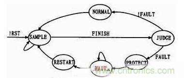 為了提高系統的可讀性以及代碼效率,軟件采用狀態機思想設計,圖5所示為系統的狀態轉換圖。系統上電復位后進入SAMPLE采樣狀態,若檢測到采樣完成標志FINISH則進入JUDGE狀態進行判斷,如果FAULT不為0即有故障信號(過壓/欠壓、過載、短路),則進入PROTECT狀態關閉輸出,并跳轉到WAIT狀態等待故障信號消除。當故障信號消除后,系統軟重啟,開始新的采樣及檢測。JUDGE狀態后如果未檢測到故障信號,則進入NORMAL正常狀態,進行電壓調整。