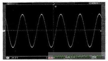 根據以上思想試制一臺400 W的樣機,采用IRF3205作為推挽升壓的功率管,HER307作為整流二極管,全橋逆變功率管則采用IRF840.前級升壓的PWM波頻率設置為20 kHz,后級SPWM波的頻率設置為18 kHz,輸出濾波電感L為1 mH,輸出濾波電容C為4.7μF.實際測試正弦交流輸出電壓精度為220 V±1%,頻率精度為50 Hz±0.1%,THD小于1.5%,逆變效率大于87%,其滿負載時的試驗波形如圖7所示(輸出經20 kΩ/100 kΩ電阻分壓測到)。
