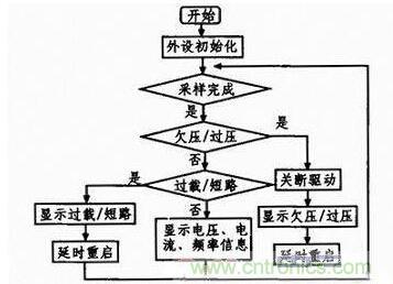 系統上電后,首先完成各個外設的初始化,主要包括系統時鐘、定時器、GPIO口、ADC、DMA、中斷及SPI的初始化。在此,定時器和中斷一旦初始化完成,PWM及SPWM波就會生成??紤]到過流、短路保護及反饋穩壓的實時性要求較高,故在中斷內完成。欠壓、過壓對實時性要求低,放在主程序內。為提升系統的性能,ADC采樣使用DMA方式傳輸數據,傳輸完成后,發出中斷申請,對采集到的數據進行簡單濾波處理,其他功能函數調用此數據完成相應的保護及穩壓功能。主程序的流程圖如圖6所示。