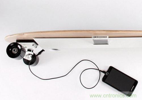 去年由荷蘭鹿特丹市的一位大學生設計的一款能對手機充電的滑板獲得了關注。滑板輪子上的發電機旋轉運行時可產生6伏電流,電流轉換成為5伏之后進入滑板的盒子裝置中,滑板運行1個小時所產生的電能可完全對一部手機充電,并且運動得越多,充電滑板存儲的電量就越多,最多可為手機進行8次充電。