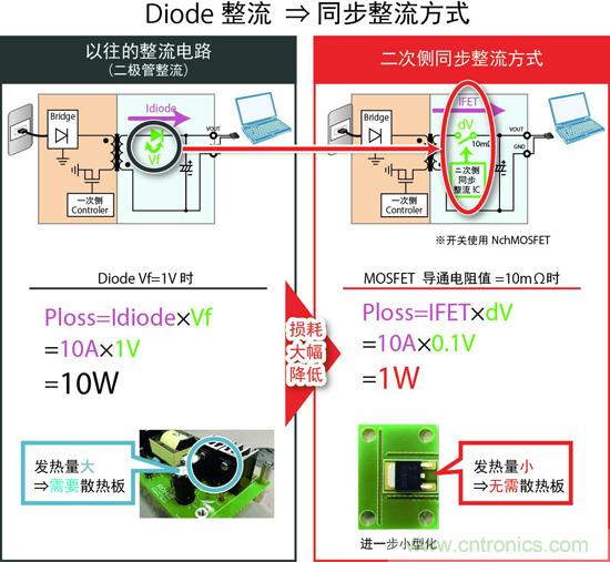 在以往的AC/DC轉(zhuǎn)換器中,基于電路簡(jiǎn)單、相對(duì)廉價(jià)的原因,整流元件一般使用二極管,但這種二極管的正向電壓(Vf)導(dǎo)致的導(dǎo)通損耗一直是高效化的障礙。另外,為抑制二極管的發(fā)熱,還需要散熱器等散熱措施,這就需要相應(yīng)的空間,在安裝方面也帶來一些問題。作為降低這種損耗的對(duì)策,如今已經(jīng)逐步開始采用同步整流方式。