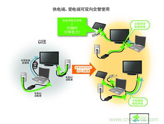 USB PD通過USB連接可實(shí)現(xiàn)高達(dá)100W的供電。USB PD根據(jù)不同設(shè)備的電源電壓要求,來調(diào)整AC/DC適配器等電源的輸出電壓。以往每臺(tái)設(shè)備都需要電源,而利用USB PD則可共享1個(gè)電源。另外,以往在設(shè)備之間主要 是數(shù)據(jù)通信,而通過USB PD可同時(shí)實(shí)現(xiàn)雙向相互供電(圖3)。