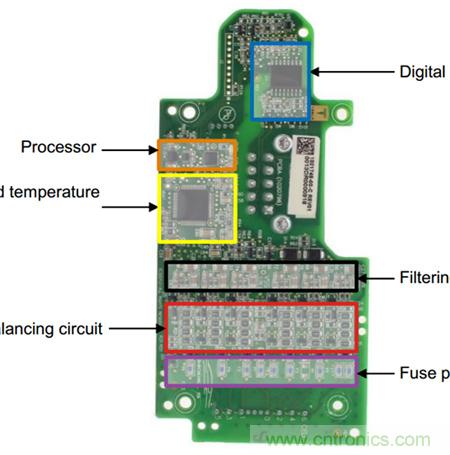 因?yàn)閮煞N均衡功能各有利弊,本來主動(dòng)均衡功能是可以替代被動(dòng)均衡功能的,但因?yàn)榻Y(jié)構(gòu)復(fù)雜成本高,而且結(jié)構(gòu)復(fù)雜之后故障率也會(huì)高而與被動(dòng)均衡處于膠著狀態(tài),業(yè)內(nèi)人士常為了哪種均衡更好爭(zhēng)論不休。特斯拉的BMS均衡功能(被動(dòng)均衡,見下圖中Cellbalancingcircuit中所指均為放電電阻)經(jīng)常被示范以證明被動(dòng)均衡強(qiáng)于主動(dòng)均衡。其實(shí)這反而證明了任何技術(shù)選擇都要和整體條件適用的道理。