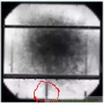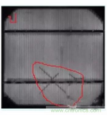 給晶硅組件施加電壓后,所激發(fā)出的電子和空穴復(fù)合的數(shù)量越多,其發(fā)射出的光子也就越多,所測(cè)得的EL圖像也就越亮;如果有的區(qū)域EL圖像比較暗,說明該處產(chǎn)生的電子和空穴數(shù)量較少(例如圖3中電池中部),代表該處存在缺陷(復(fù)合中心);如果有的區(qū)域完全是暗的,代表該處沒有發(fā)生電子和空穴的復(fù)合(圖3和圖4中紅線所標(biāo)處),也或者是所發(fā)光被其它障礙所遮擋(圖3和圖4主柵線處),無(wú)法檢測(cè)到信號(hào)。