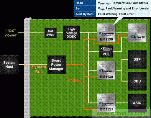 (2)另一常見的系統電源要求是能夠進行遠程監視,對電源各參數進行實時監視、故障報警和相應調節。而最簡單、最便宜、最緊湊的方式是使用集成了遠程監視功能和相應的通信總線的電源調節器。通過智能電壓ID(SmartVID)特性,Altera的Arria 10 FPGA和SoC通過PMBus接口,確定與Enpirion電壓調節器系統之間所需的VCC電壓和通信,將內核電壓軌盡可能動態調整到最小,而不會犧牲系統性能。同時,支持PMBus的Enpirion的ED8101P0xQI單相數字控制器,與ET4040QI大電流電源配對使用,可實現對FPGA的多種遠程監視和低功耗特性。