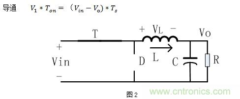 當PWM驅動高電平使得NMOS管T導通的時候,忽略MOS管的導通壓降,等效如圖2,電感電流呈線性上升,MOS導通時電感正向伏秒為: