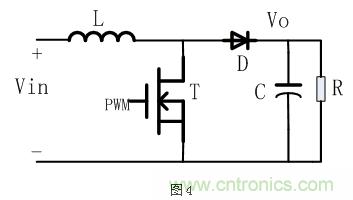 Boost升壓型電路拓撲,有時又稱為step-up電路,其典型的電路結構如下圖4所示: