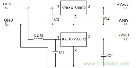 因此,用2只K7812-500R2的產品,實現BUCK與BUCK-BOOST電路相結合,可以得到±12V輸出,低的紋波和噪聲可以給運放進行供電。