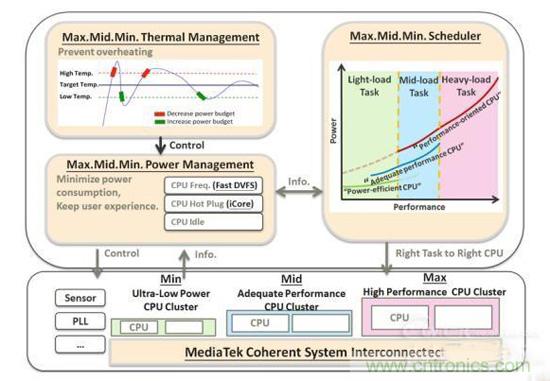 CorePilot 1.0包含三個方面的技術。第一,最新的異構調度算法,能夠更有效的平衡每顆CPU核心的工作負荷從而提高系統工作效率。第二,自調式溫控技術,可根據溫度的變化來打開或者關閉CPU核心,在特定范圍內進行動態調節功耗預算,進而獲得更好的性能提升。第三,動態功耗管理技術,可通過動態電壓、頻率調節模塊來檢測正在進行的進程和任務負荷量,從而進行自動調節CPU的頻率、電壓,最終決定開啟或者關閉某些CPU核心,以便更有效的降低閑置CPU核心所帶來的熱量和能耗。