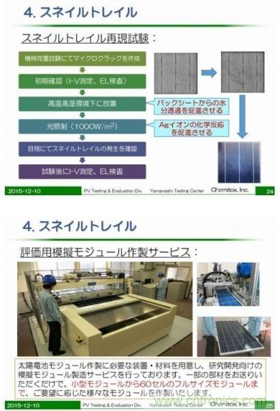 Chemitox提供制作這種驗證用太陽能電池板和再現蝸牛紋產生條件的服務,推動了開發。例如,封裝材料廠商只需帶來想驗證的封裝材料,從電池板的制作到評測就就能全部完成。