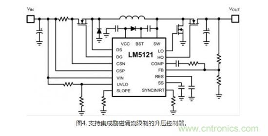 第三個保護選項是一個具有集成涌入限制控制的升壓控制器。這個方法仍然需要將一個附加的MOSFET用作保護器件,因為升壓的高端元件(一個續流二極管或同步MOSFET)無法反向。然而,如圖4所示,與熱插拔控制器方法相比,將升壓和保護控制集成在一個IC中有助于降低解決方案復雜度和尺寸,同時也提供了很多其它保護特性。