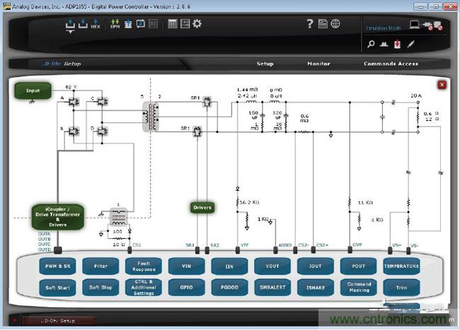 圖形用戶界面(GUI)是這種困境的一種解決方案。因為GUI可簡化數字電源的編程。許多數字控制器IC供應商均提供GUI。通常,GUI的設計方式能夠使電源專家直觀地使用它們。圖1顯示了這樣的圖形用戶界面。您可用鼠標選擇電源的不同方面,在屏幕上的不同功能框圖中進行不同的設置。