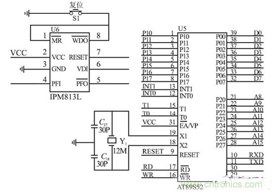 單片機最小系統(tǒng)圖如圖3 所示。MCU 選用ATMEL公司的AT89S52 單片機。AT89S52 是一種低功耗、高性能的CMOS 工藝的8 bit 單片機,與標準MCS51 的引腳和指令完全兼容。其外接晶振頻率范圍為0 Hz ~33 MHz,內(nèi)置256 B 片內(nèi)RAM,3 個16 位定時器/ 記數(shù)器,片內(nèi)看門狗。其性能好于我們常用的89C52 系列單片機。