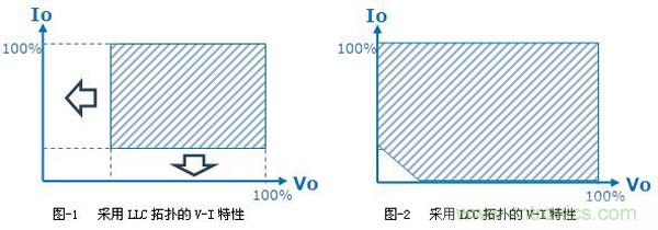 目前大功率恒流LED驅動電源的設計,比較常見的軟開關拓撲是LLC,它的輸出V-I特性如圖-1所示。從圖中可見,LLC拓撲的輸出電壓、電流范圍下限都比較高。隨著用戶對調光要求的越來越高,LLC拓撲的這種輸出特性的局限性也越來越明顯。如果輸出直接恒流,LLC拓撲在恒流時的電壓不能夠達到很低,即對燈珠個數的適應性有較大局限性;當需要對電壓相對固定的特定燈串時進行調光的時候,調光電流在相對較窄的頻率范圍內不能達到比較低范圍。如果需要做到深的調光深度,往往需要間歇工作以達到小的平均電流,甚至采用額外一級DC/DC電流來實現,產生額外的紋波電流或增加系統成本及降低效率。