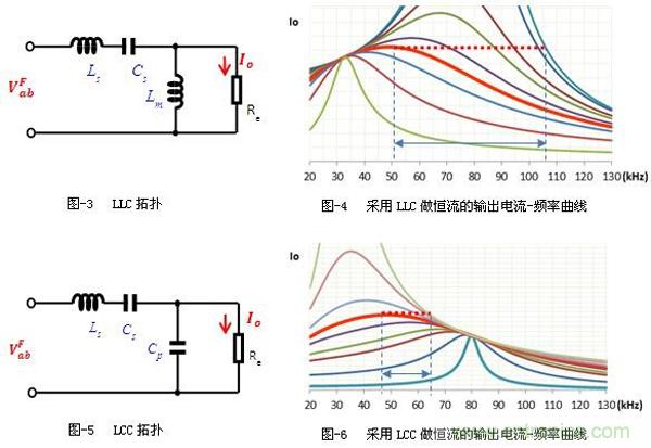 兩圖中虛線是恒流軌跡線,當負載電阻變化時,工作頻率需要做相應的變化使得電流保持穩定不變,從圖-4中可以看出,采用LLC拓撲實現恒流輸出時,不同負載線之間的間隔較大,意味著頻率變化較大。而從圖-6中可以看出,采用LCC拓撲實現恒流輸出時,不同負載線之間的間隔比較緊密,意味著頻率變化較小。也就是說,LCC拓撲實現恒流時,頻率隨負載變化的范圍比LLC的要小很多。