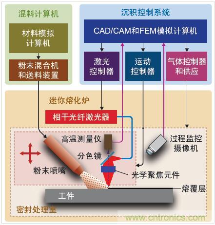 混料系統(tǒng)包含幾種不同的熔覆粉末以及配備了材料模擬軟件的計(jì)算機(jī)。迷你熔化爐包括光纖激光器和密封處理室,而后者包含光學(xué)聚焦元件、送粉