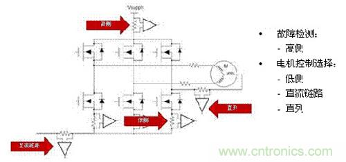 如圖1所示,基本上有三種不同的方法來測量三相電動機驅動系統中的電流:低側、直流鏈路和直列測量。圖1所示的是傳統三相PWM逆變器,該逆變器使用三對功率MOSFET(絕緣柵雙極晶體管IGBT也很常見)來驅動直流電動機。該圖還包括高側電流感應,其通常在顯著錯誤情況下使用,比如接地電路短路的情況。