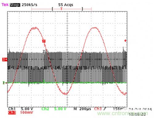 直列式電流感應方法看似是最合理的,因為這是最終要測量的電流。但這種方法存在一個問題。驅動MOSFET或IGBT的PWM信號對電流感應放大器造成嚴重破壞。感測電阻處的共模信號從電源電壓被驅動到接地,具有非常快速的瞬態開關特性,而電流感應放大器試圖測量感測電阻本身的小差分信號。圖2是由PWM逆變器產生的正弦相電流(紅色波形)的示波器截圖。這種情況下,PWM頻率為100兆赫(MHz),由LMG5200 GaN半橋功率級提供(更多詳細信息,請參見底部的TI設計)。需要注意的是,快速開關信號是直列式電流感應放大器測量相電流時所接收的信號。這就像在有颶風的情況下,當杯子在海上漂浮,而試圖測量杯中液體一樣。難怪大多數設計師會考慮使用低側感應!下面我們將介紹另外一種方法。