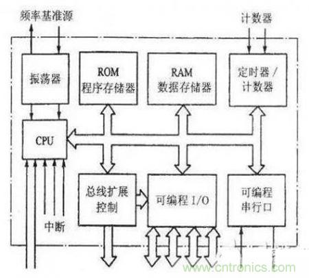 Ⅰ:中央處理器CPU,包括運(yùn)算器、控制器和寄存器組。是MCU內(nèi)部的核心部件,由運(yùn)算部件和控制部件兩大部分組成。前者能完成數(shù)據(jù)的算術(shù)邏輯運(yùn)算、位變量處理和數(shù)據(jù)傳送操作,后者是按一定時(shí)序協(xié)調(diào)工作,是分析和執(zhí)行指令的部件。