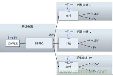 該電源的輸入是新能源乘用車常規(guī)的12V電源,該電源通常波動(dòng)范圍是8~16V,而驅(qū)動(dòng)電源的輸出需要相對(duì)穩(wěn)定。需要設(shè)計(jì)多組寬壓輸入、定壓輸出的隔離電源。本設(shè)計(jì)把電源分成兩級(jí):前級(jí)電源實(shí)現(xiàn)寬壓輸入、定壓輸出功能,后級(jí)實(shí)現(xiàn)隔離功能,結(jié)構(gòu)見圖1.