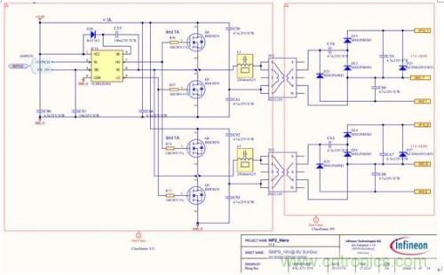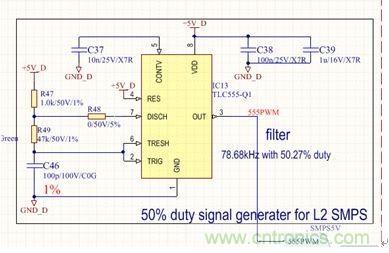 前級(jí)電源屬于典型定壓設(shè)計(jì),無需給出設(shè)計(jì)原理,本文重點(diǎn)介紹后級(jí)半橋電路。具體原理圖見圖2和圖3。圖2為采用汽車級(jí)定時(shí)器電路設(shè)計(jì)的50%占空比信號(hào)發(fā)生器,用于給半橋開關(guān)電源提供控制信號(hào),其中R49可以用來調(diào)整開關(guān)頻率,一般可以設(shè)定在70kHz到300kHz之間,頻率選擇主要根據(jù)電路板實(shí)際空間尺寸和變壓器的伏秒積進(jìn)行折衷選取。
