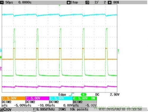 選取高占空比和低占空比兩個(gè)工況,觀察相關(guān)信號(hào)的波形,見圖4和圖5。其中橙色的1通道顯示低壓側(cè)驅(qū)動(dòng)輸入信號(hào),粉色2通道顯示-8V電源輸出端的波形,藍(lán)色3通道顯示+15V電源輸出端波形,綠色4通道顯示門極輸出波形。