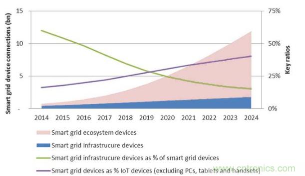 這些數字有三個明確的信息。首先,物聯網智能電網中包括的設備總量預計將迅速增長,從今天的不到10億而2024年增加將達到120億。第二,也許不奇怪的是,在依賴于智能電網功能的設備之前,將采用與智能電網基礎設施相關的設備。第三,與智能電網相關的設備將占據連接設備的越來越多的份額。這些預測顯示,到2024年,預計所有物聯網設備云連接(不包括PC,平板電腦和手機)的40%以上屬于智能電網生態系統,將智能電網和VPP概念牢固地置于物聯網(IoT)的核心之中。