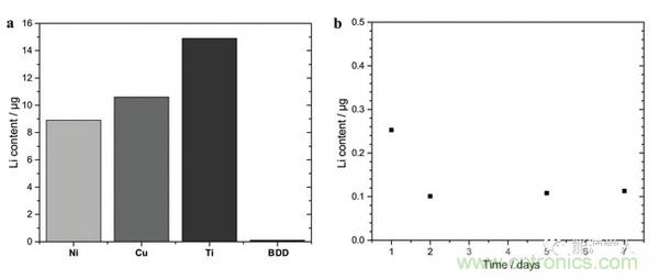 不僅活性物質本身存在俘獲鋰的能力,集流體也存在同樣的情況。為了研究這一情況,作者將鎳、銅、鈦、硼摻雜金剛石四種物質分別與金屬鋰直接接觸,在50℃條件下密封保存1周后發現,鎳、銅和鈦重量變化都非常大(通過實驗前后,樣品的質量變化進行判斷),說明金屬鋰可以直接向這三種物質中進行擴散。只有硼摻雜金剛石的重量未發生變化,通過HAXPES和TOF-SIMS檢測也未發現Li的信號,因此硼摻雜金剛石最為適合作為負極集流體。