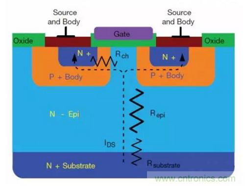 圖1顯示了一種傳統平面式高壓MOSFET的簡單結構。平面式MOSFET通常具有高單位芯片面積漏源導通電阻,并伴隨相對更高的漏源電阻。使用高單元密度和大管芯尺寸可實現較低的RDS(on)值。但大單元密度和管芯尺寸還伴隨高柵極和輸出電荷,這會增加開關損耗和成本。另外還存在對于總硅片電阻能夠達到多低的限制。器件的總RDS(on)可表示為通道、epi和襯底三個分量之和: