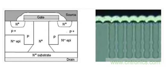 通常,高壓的功率MOSFET采用平面型結構,其中,厚的低摻雜的N-的外延層,即epi層,用來保證具有足夠的擊穿電壓,低摻雜的N-的epi層的尺寸越厚,耐壓的額定值越大,但是其導通電阻也急劇的增大。導通電阻隨電壓以2.4-2.6次方增長,這樣,就降低的電流的額定值。為了得到一定的導通電阻值,就必須增大硅片的面積,成本隨之增加。如果類似于IGBT引入少數載流子導電,可以降低導通壓降,但是少數載流子的引入會降低工作的開關頻率,并產生關斷的電流拖尾,從而增加開關損耗。