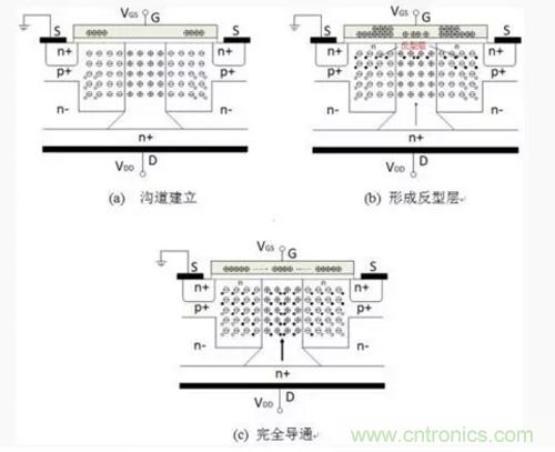 當MOS導通時,柵極和源極的電場將柵極下的P區反型,在柵極下面的P區產生N型導電溝道,同時,源極區的電子通過導電溝道進入垂直的N+區,中和N+區的正電荷空穴,從而恢復被耗盡的N+型特性,因此導電溝道形成,垂直N+區摻雜濃度高,具有較低的電阻率,因此導通電阻低。