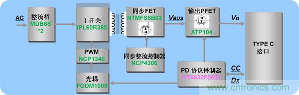 該設計主要采用安森美半導體的初級端高頻準諧振反激式PWM控制器NCP1340、次級端同步整流控制器NCP4306、同步FET NTMFS6B03、開關FET ATP104和偉詮的PD3.0協議控制器WT6632F/WT6615F。方案框圖如圖1所示。