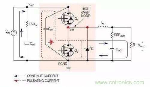 圖4顯示的是升壓轉換器中的連續電流回路與脈沖電流回路。此時,應在靠近MOSFET QB與升壓二極管D的輸出端放置高頻陶瓷電容CHF.